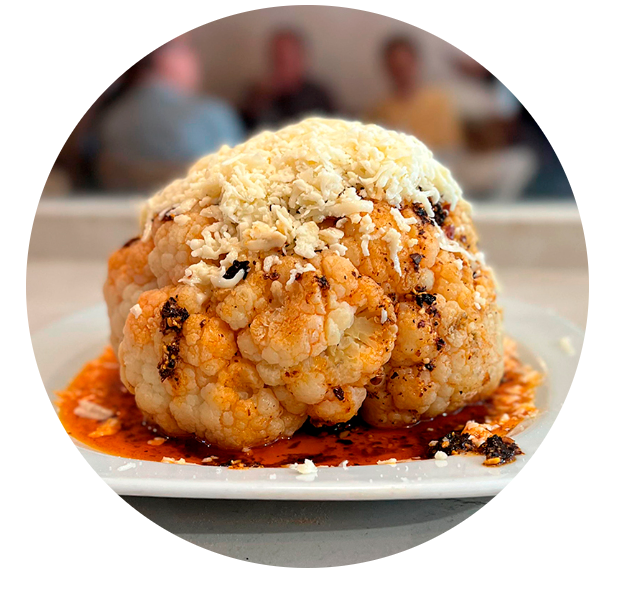 Lechuga, coliflor, jitomate cherry, pollo al pesto y vinagreta de la casa