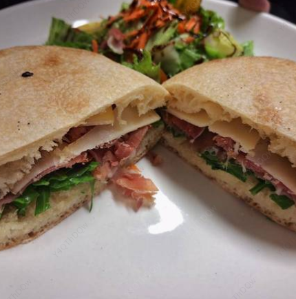 Ciabatta casera, prosciutto italiano, queso italiano, arugula, cherry tomates y aceite extra virgin de oliva, acompañado de ensalada de guarnición.
