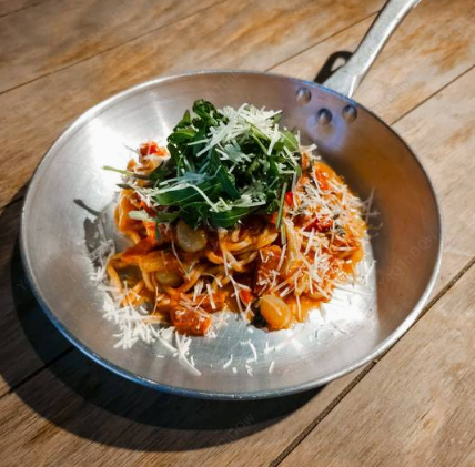 Tonnarelli (spaghetti artesanal) con arugula, jamón serrano Italiano, tomates cherry y queso parmesano.