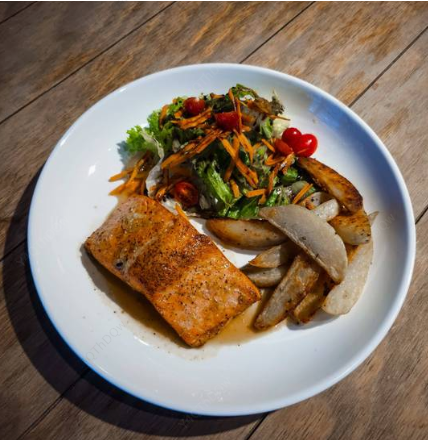Salmon al sartén con naranja, vino blanco y guarnición de verdura.