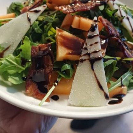 Arugula, melón, queso parmesano, tocino crujiente, aderezo balsámico.