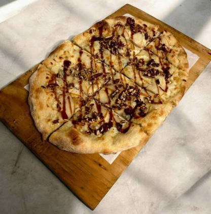 Pizza base blanca con queso mozzarella, queso gorgonzola, pera, nueces y reducción de balsámico.
