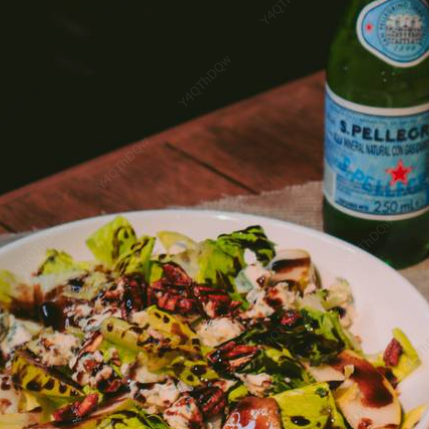 Mix de lechugas, nuez caramelizada, pera y queso gorgonzola, aderezo balsámico.