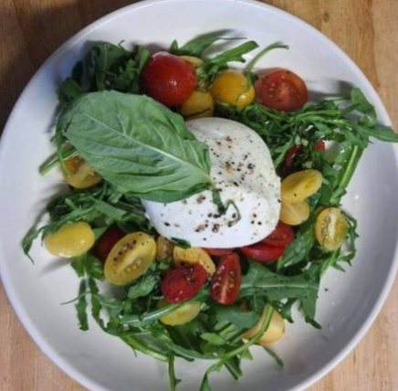 Mix de lechugas , queso burrata fresco, cherry tomates, aceite extra virgin de oliva y pimienta negra.