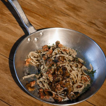 Tonnarelli (spaghetti artesanal) con salchicha Italiana, champiñones y salsa de trufa.