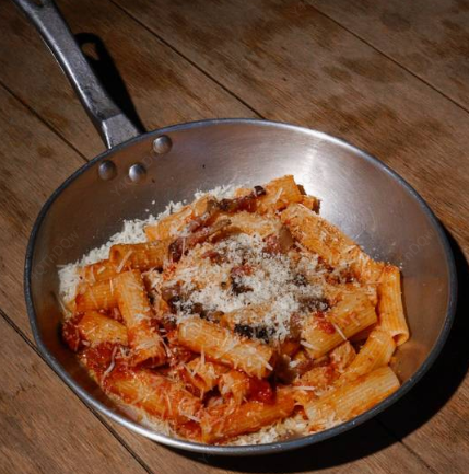 Rigatone con salsa de tomate, guanciale y queso pecorino.