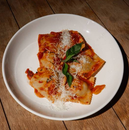 Pasta fresca rellena de carne en salsa de tomate y albahaca.