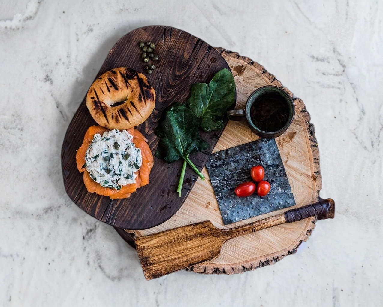 Bagel de Salmón a la plancha (120 grs.), Crema Artesanal de Espinacas y Champiñones, Queso Manchego Menonita y Queso de Cabra Cenizo.