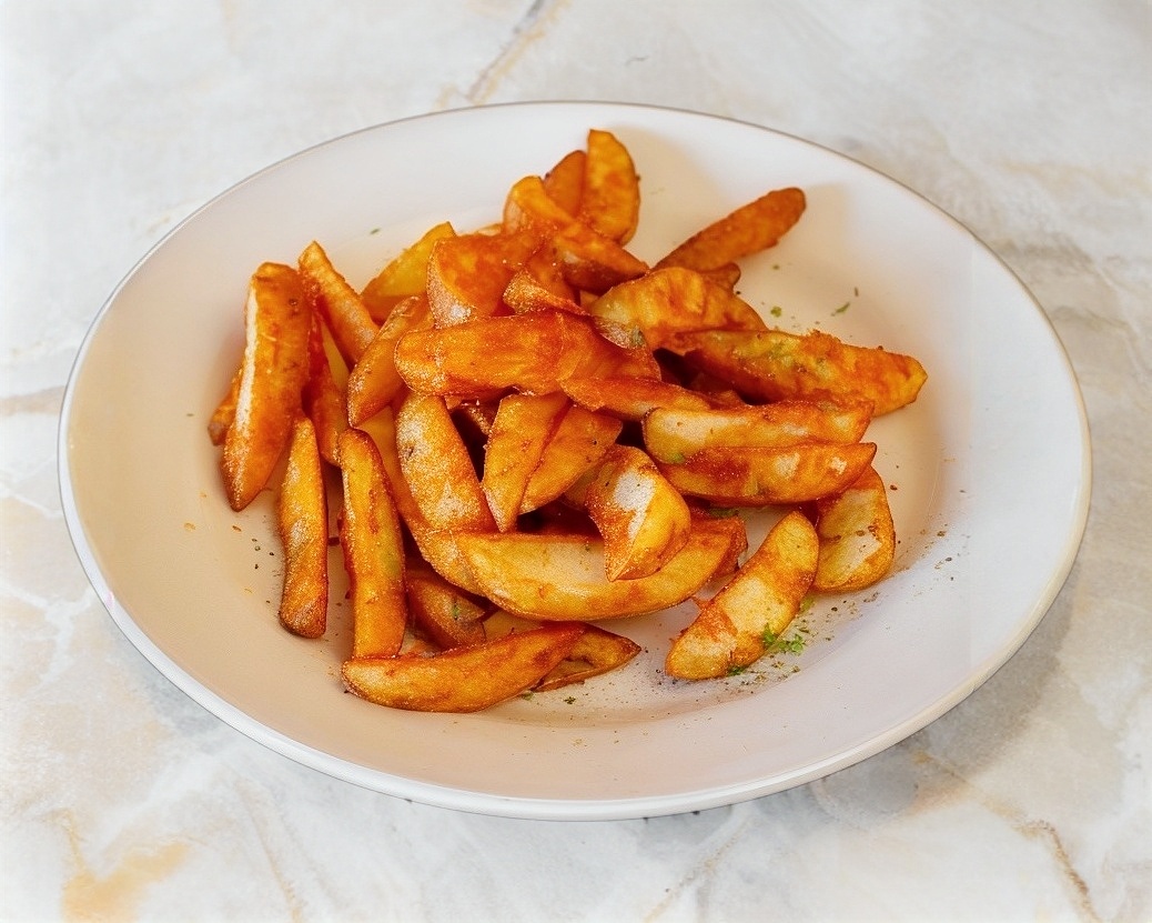 Papas cortadas en gajo (300 gr.) fritas y sazonadas con nuestra mezcla de Paprika y queso Cheddar.