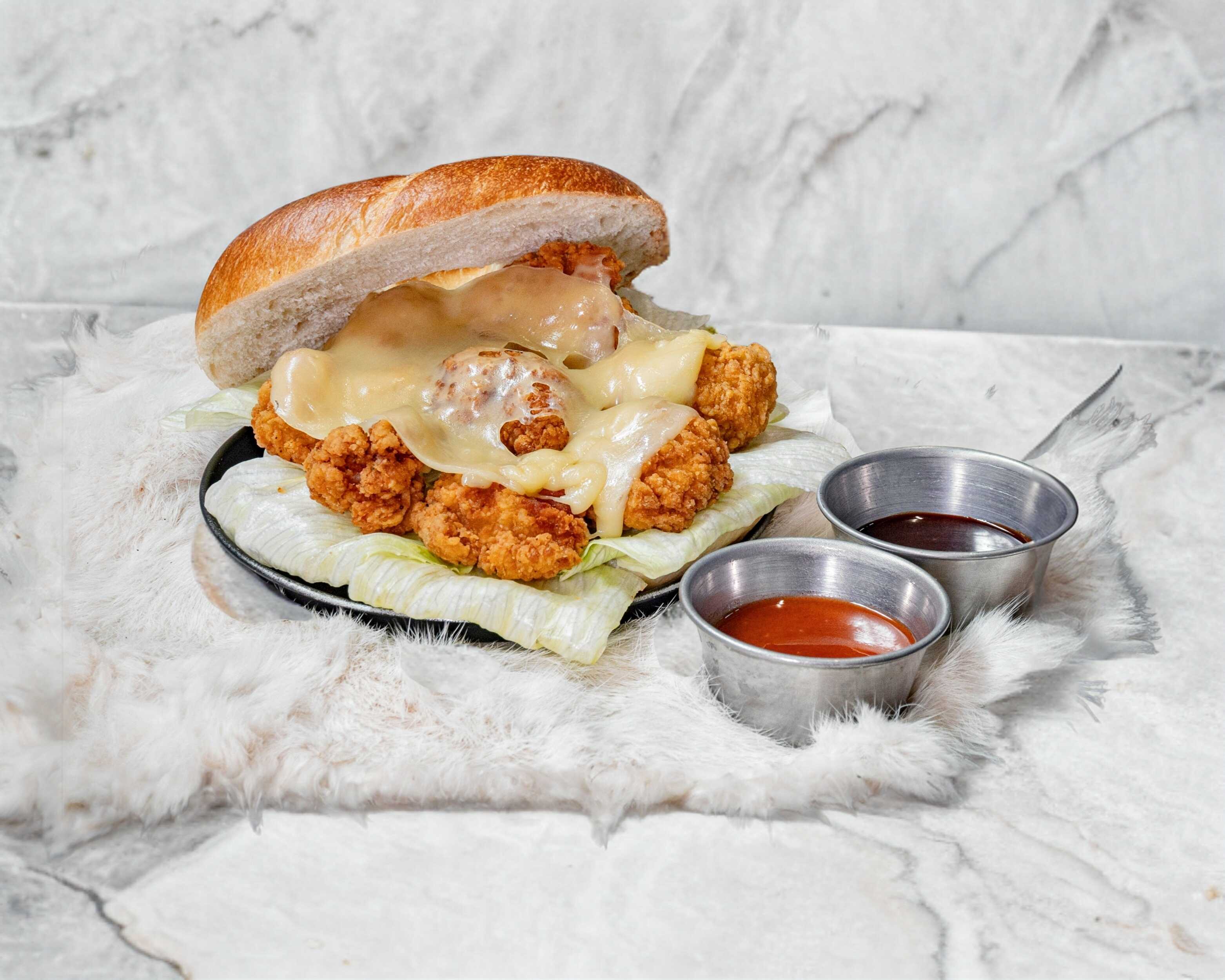 Bagel de Boneless de Pollo (175gr), bañados en salsa buffalo o salsa BBQ, lechuga, queso gouda y queso cheddar