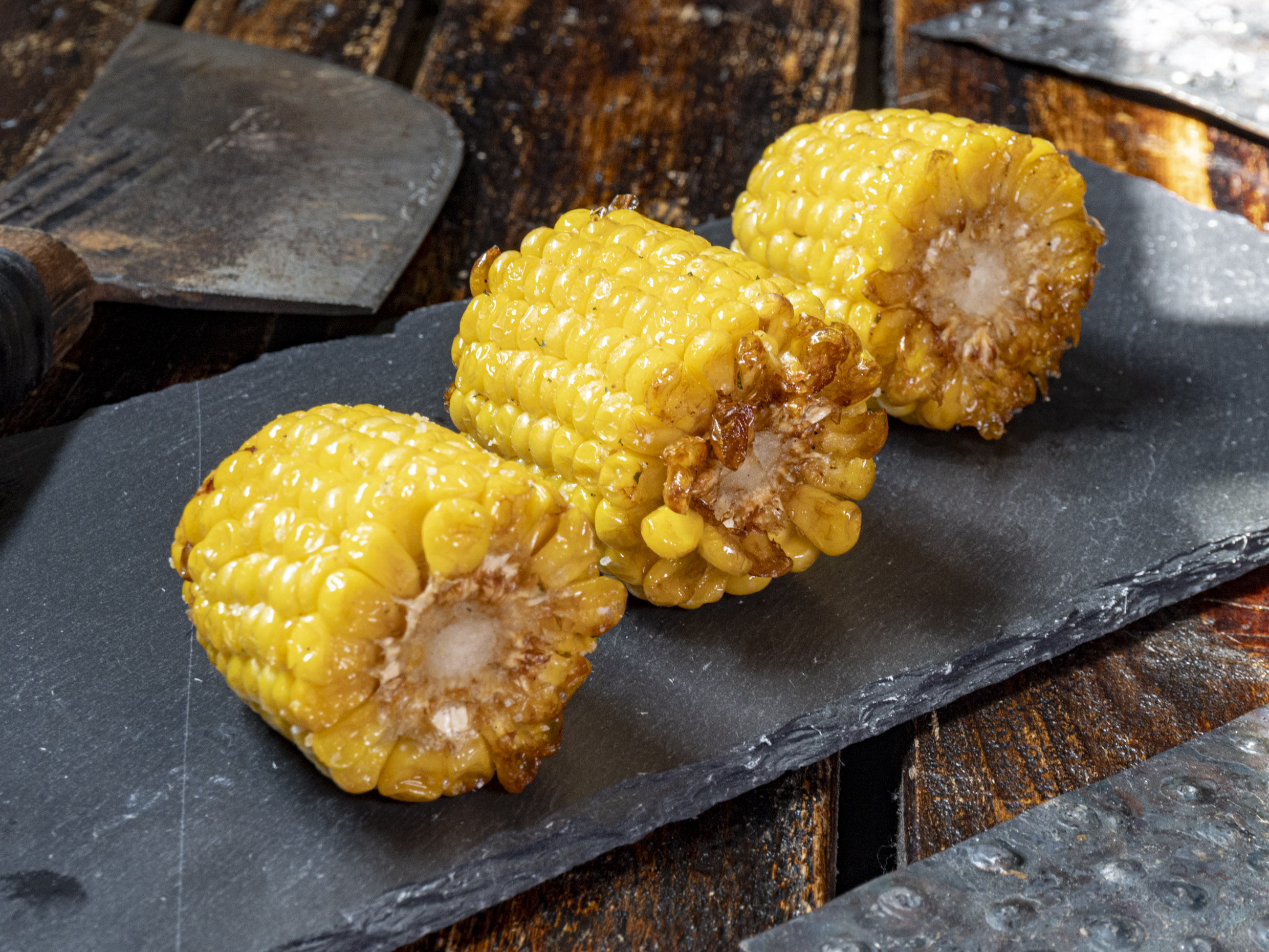 Una pieza de elote dulce partida en 3, con nuetsra mezcla secreta de sal y especias