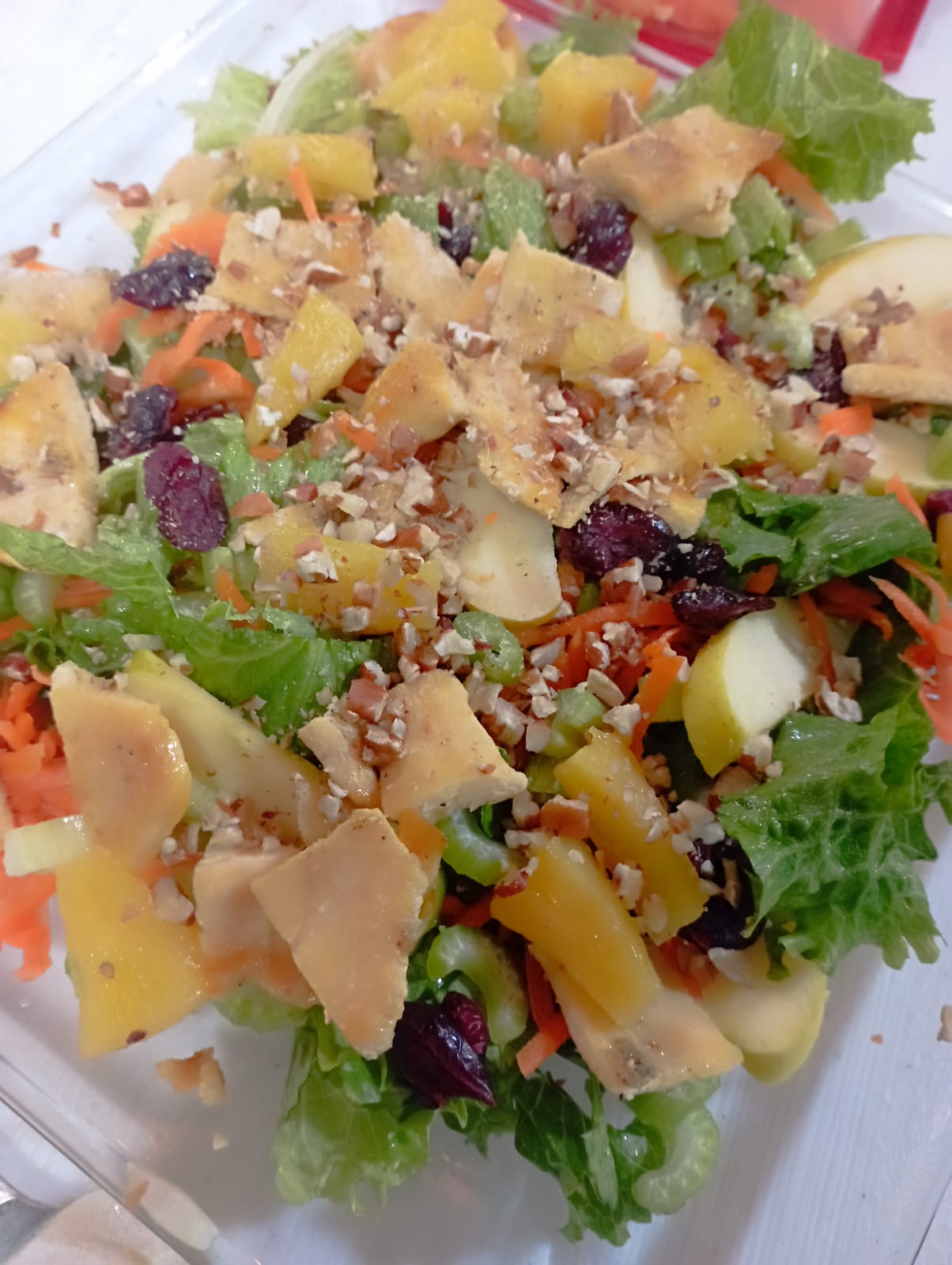Mix de pechuga de asada, lechuga, manzana, zanahoria, nuez, piña y arándanos.