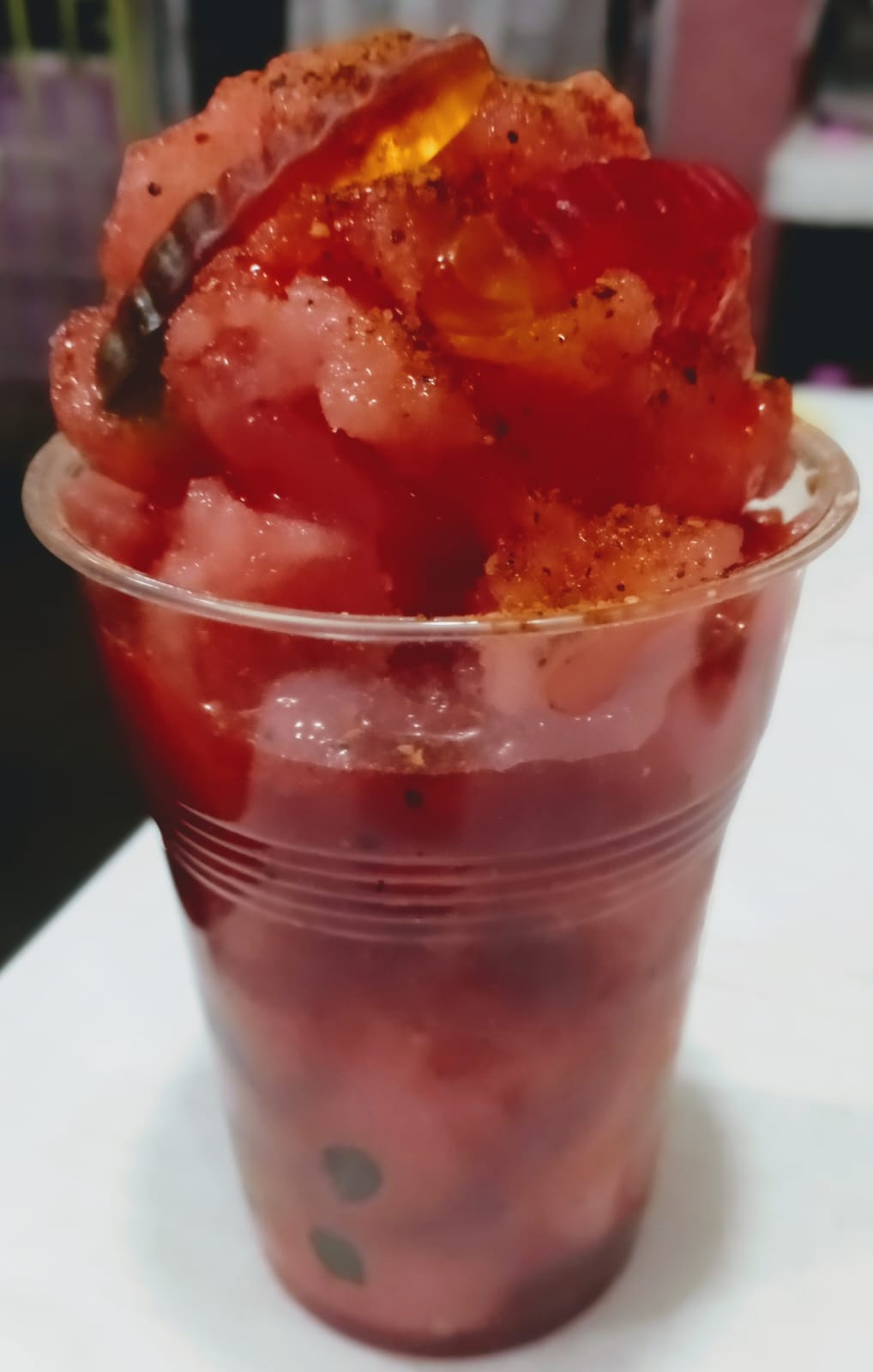 Elaborado con fruta 100%, decorado con gomitas sorpresa y dulce de tamarindo.