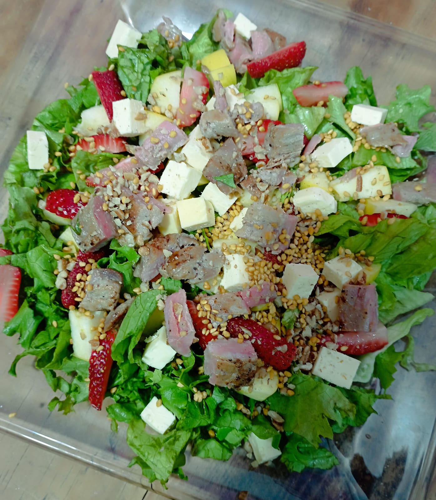 Mezcla de lechuga, fresas, manzana, nuez, arándanos, queso manchego, fajitas de arrachera y ajonjolí garapiñado.