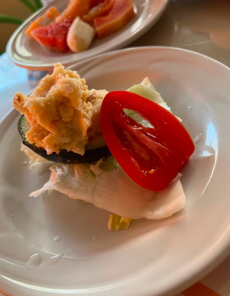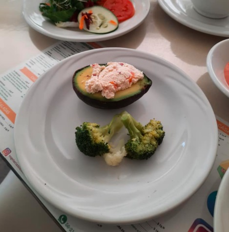 Aguacate relleno de queso cottage, papa o requesón. Acompañado con ensalada.