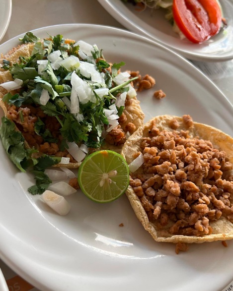 Aguacate picado acompañado con jitomate, cebolla, cilantro y totopos.