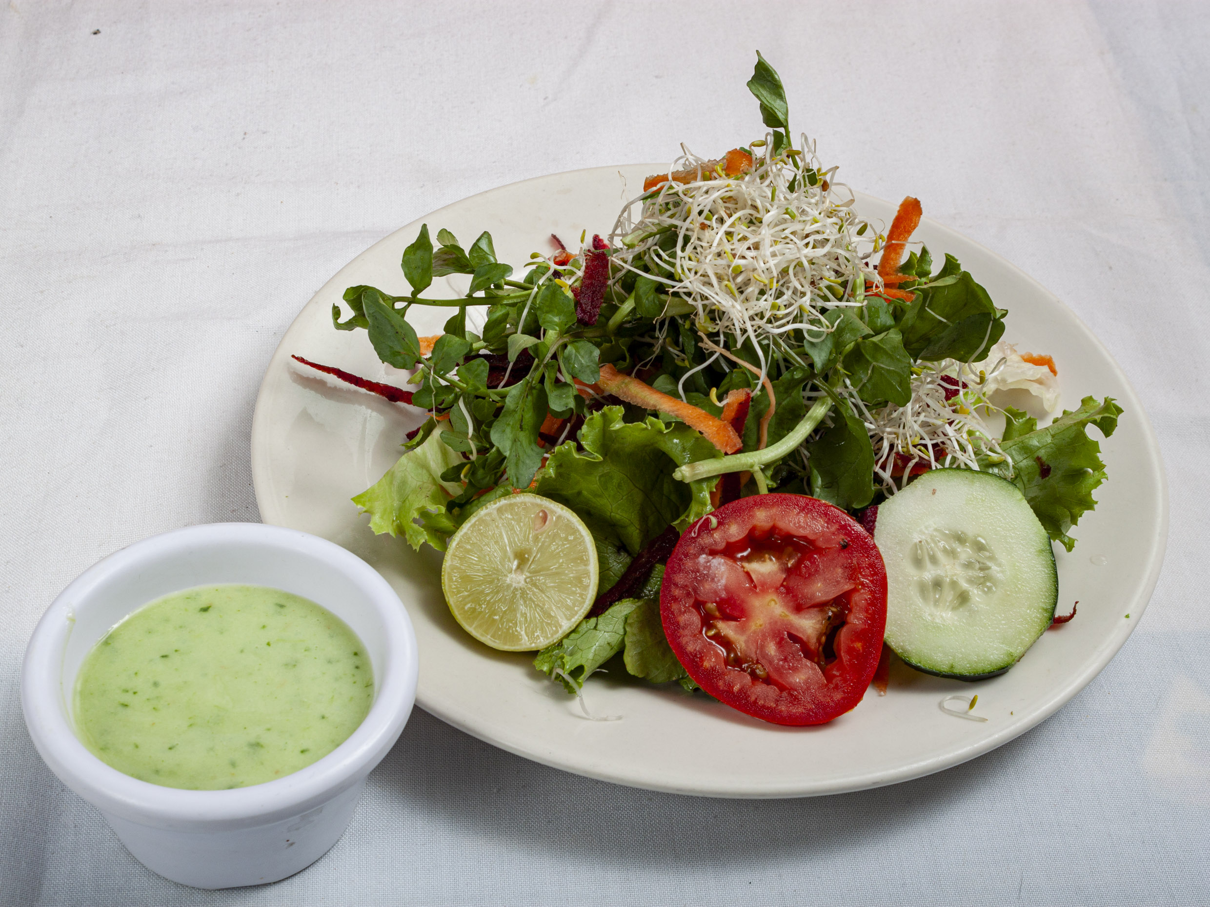 Verduras crudas, lechuga, jitomate, zanahoria, betabel, berros, germinado de alfalfa, pepino aderezo de la casa. Aproximadamente 4 ord. Chicas.