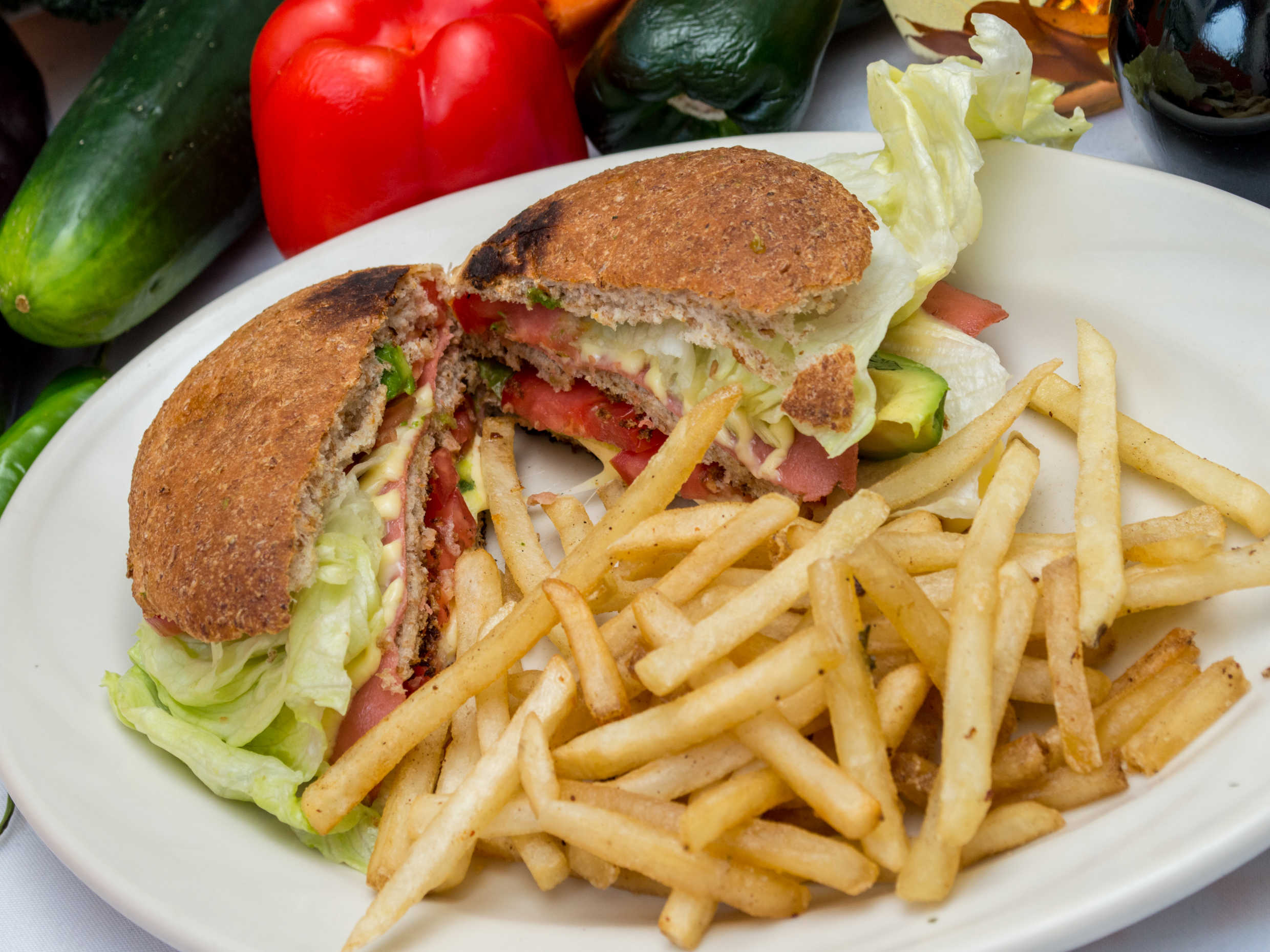Emparedado de queso manchego, lechuga, germinado de alfalfa, aguacate y jitomate hecho con pan integral. Acompañado con ensalada o papas a la francesa.