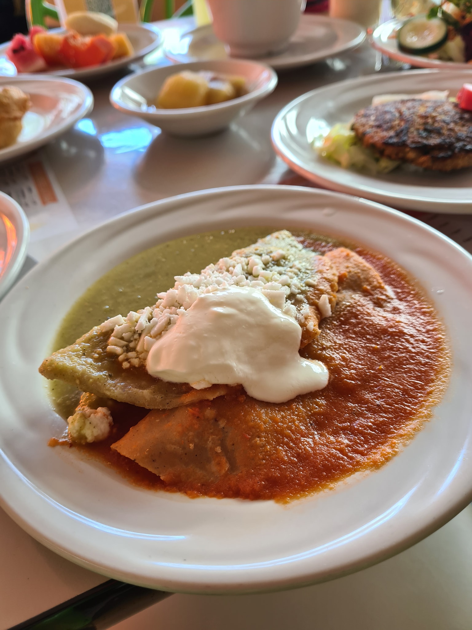 Enchiladas verdes, rojas o de mole rellenas de requesón acompañadas con crema, queso, frijoles de la olla. Incluye café americano 10 oz. y ensalada de frutas.