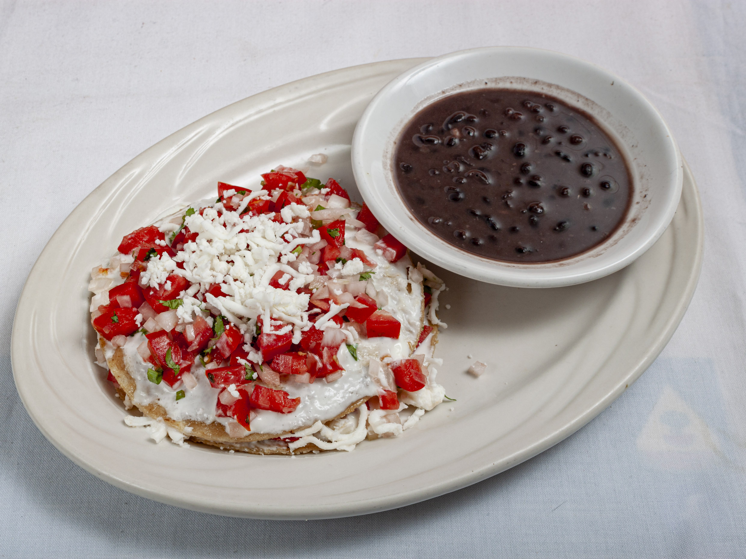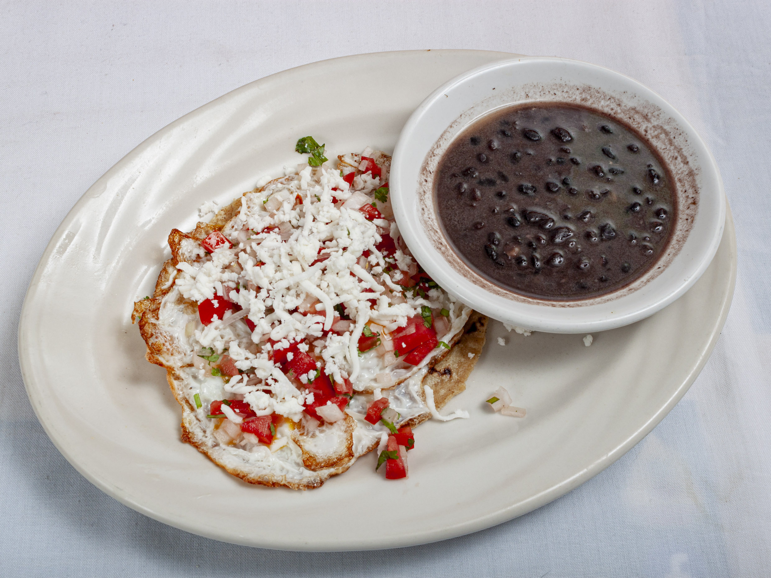 2 Huevos estrellados sobre una tortilla de maíz, bañados por salsa mexicana acompañados con frijoles de la olla.Tu desayuno incluye Cafe Americano ( 10oz ) o Te del Dia, Tambien Una ensalada de Frutas o Vaso con Jugo de Naranja natural ( 10 oz. ).
