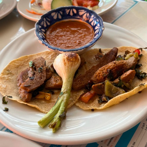 3 Pzas de tortillas de maiz acompañadas con arrachera de soya marinada, cebollas sazonadas a la plancha, salsa de aguacate, limones y salsa del dia.