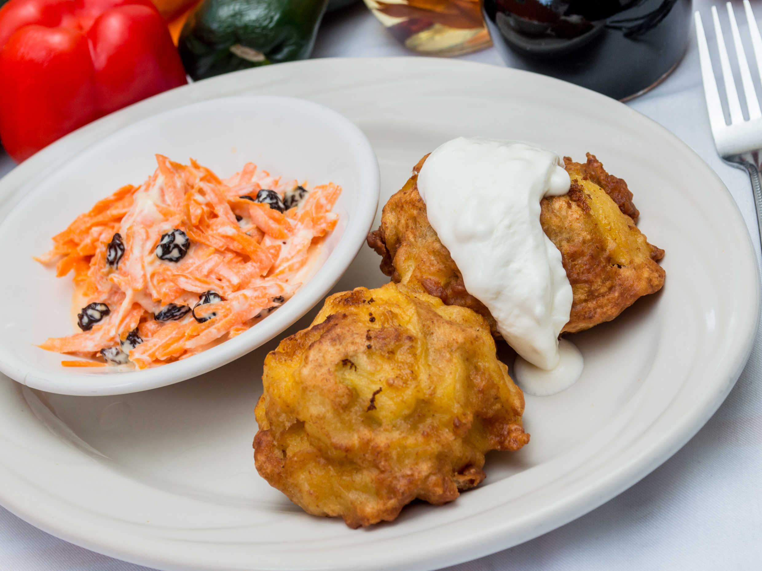Croquetas de manzana acompañadas de crema y ensalada de zanahoria rallada.
