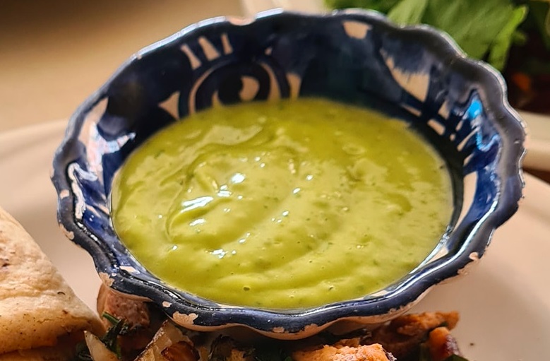 Aguacate machacado acompañado de cebolla, chiles verdes, cilantro picado y totopos.