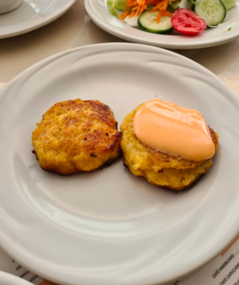 Croquetas de elote acompañadas con puré de papaya y ensalada de zanahoria.