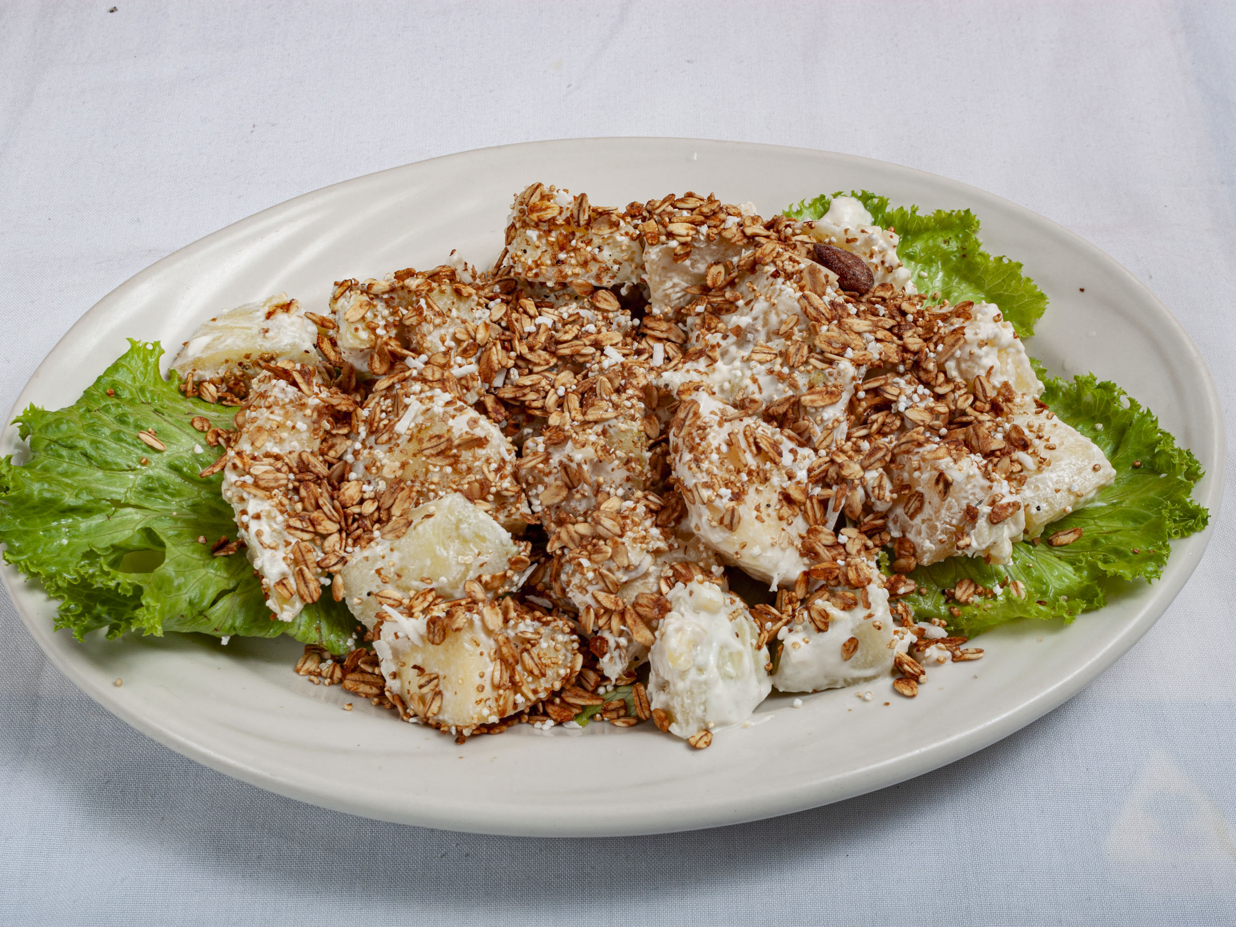 Ensalada tradicional de manzana, lechuga, manzana aderezada con crema, apio y granola. Aproximadamente 4 ord. Chicas.