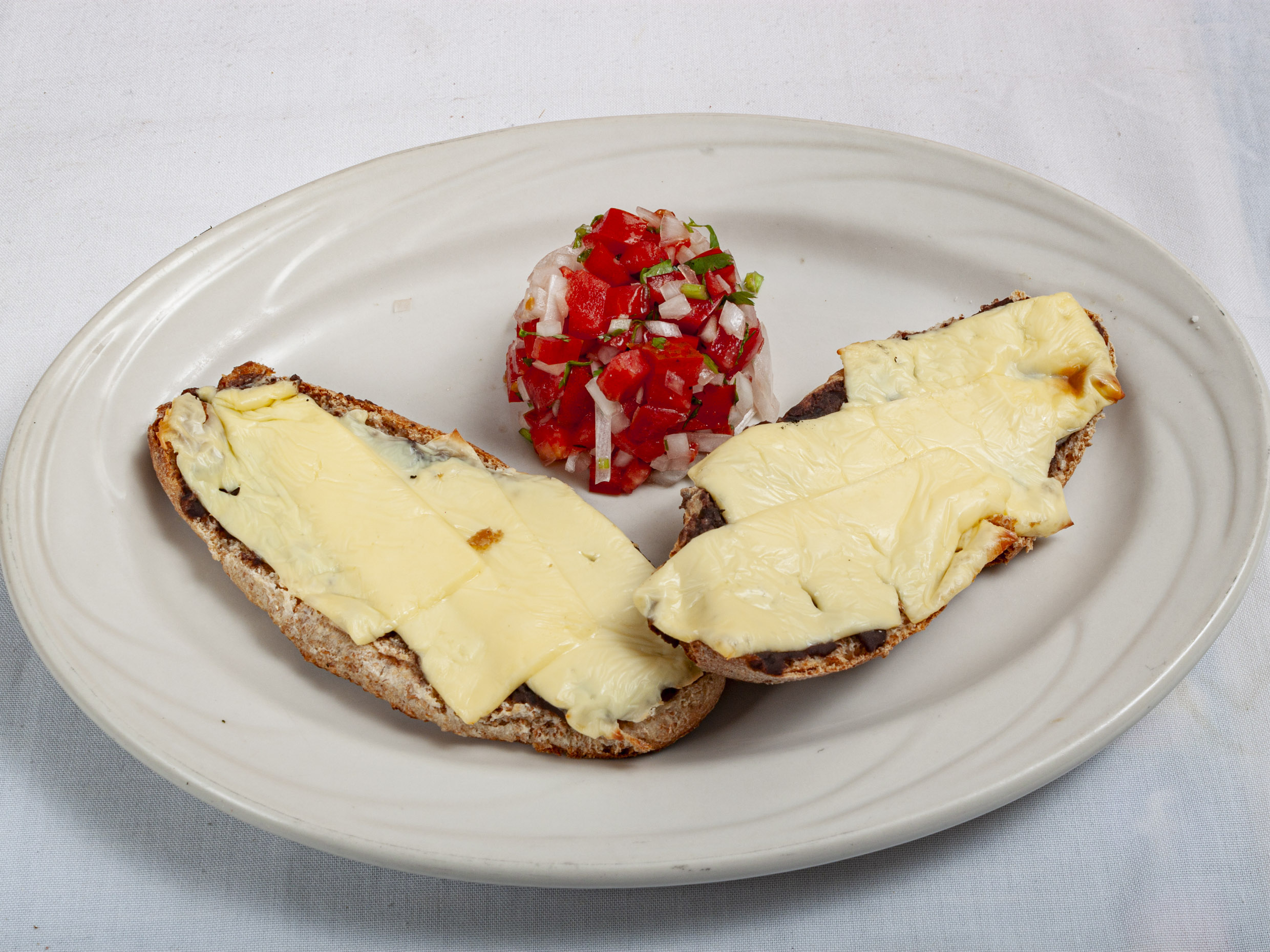 Pan integral partido por la mitad, un poco de mantequilla, frijoles refritos, queso manchego gratinado y salsa mexicana. Tu desayuno incluye Cafe Americano ( 10oz ) o Te del Dia, Tambien Una ensalada de Frutas o Vaso con Jugo de Naranja natural ( 10 oz. ).