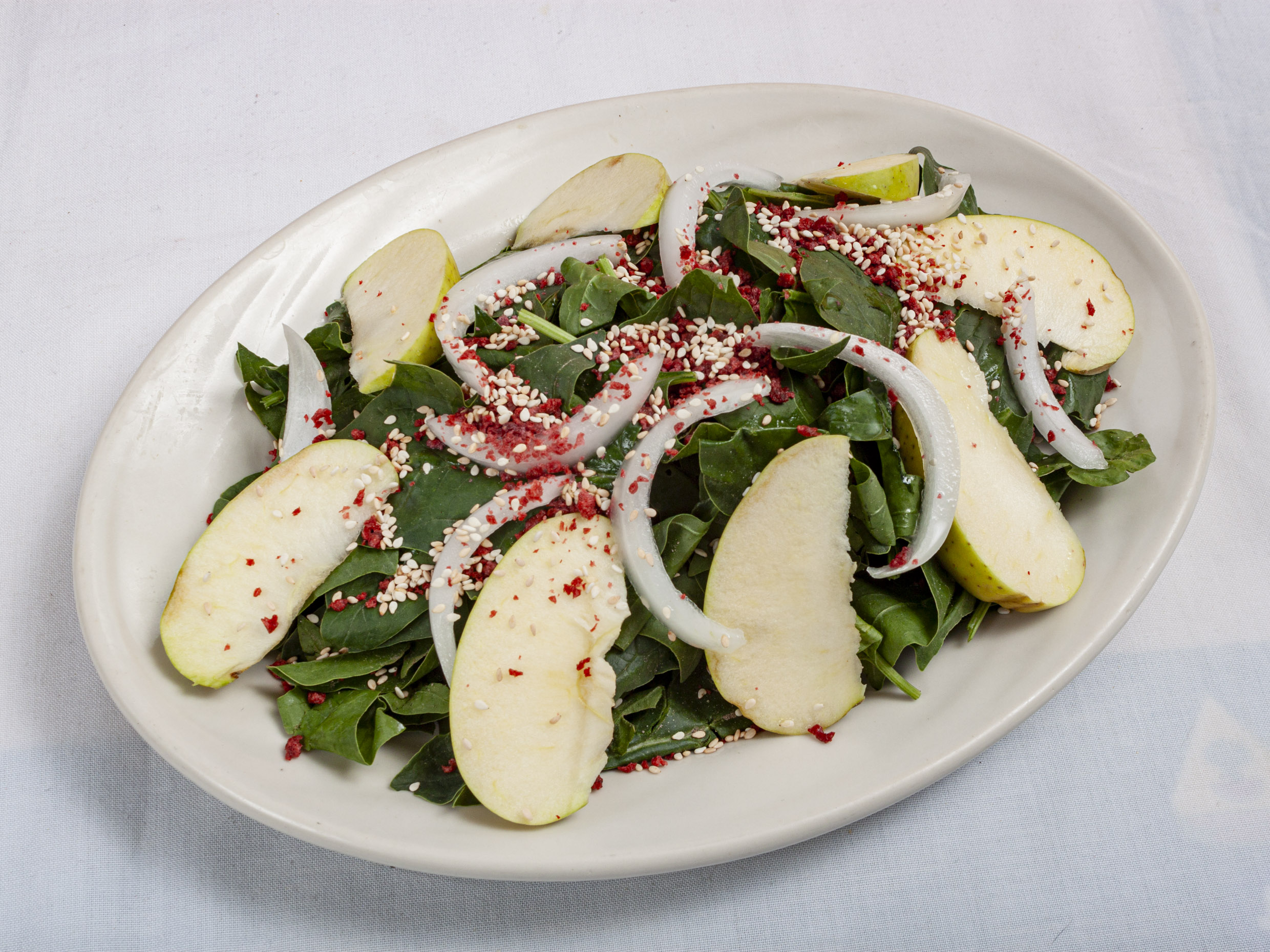 Espinaca con tocino de soya y rico aderezo de ajonjolí.