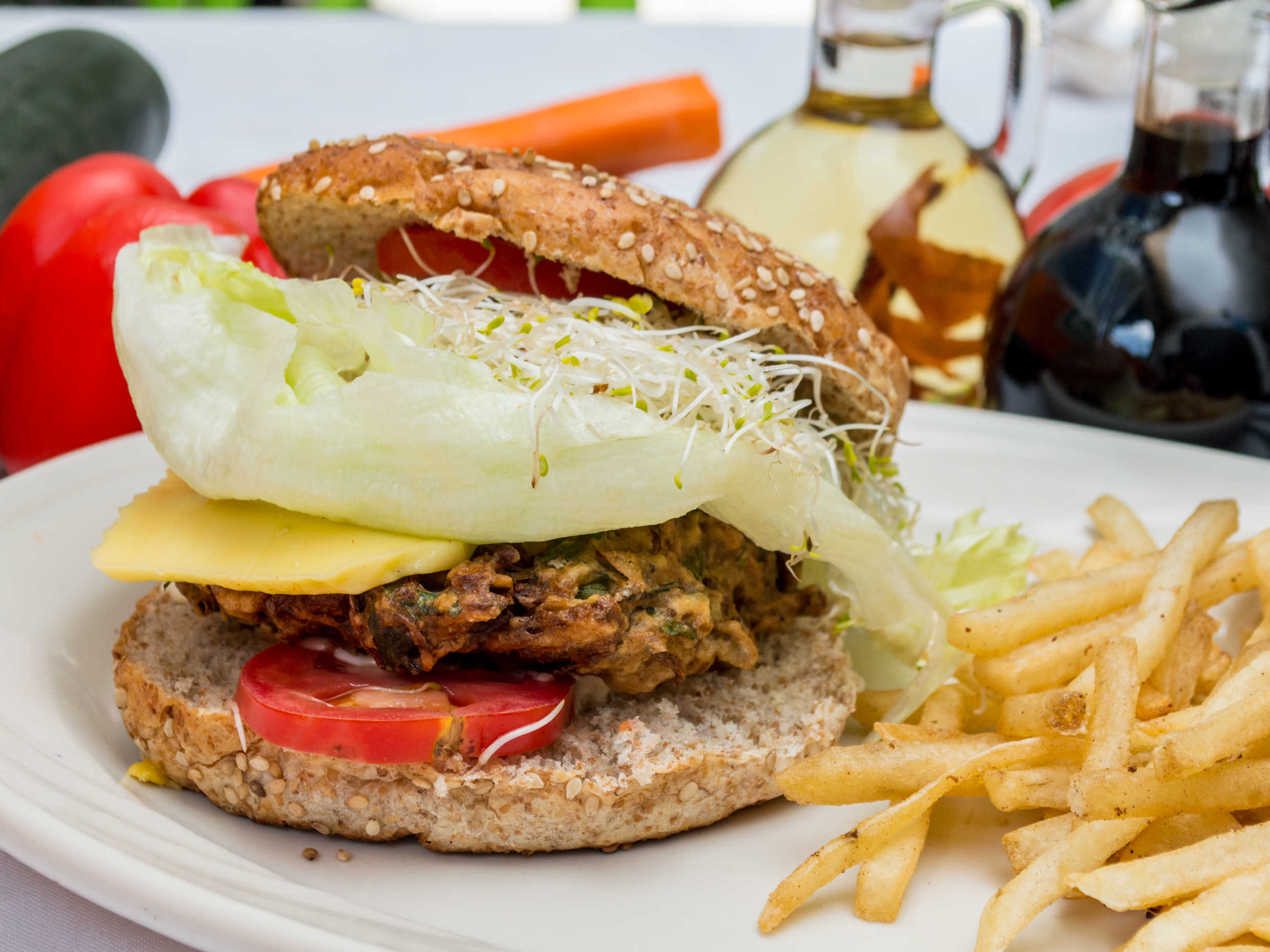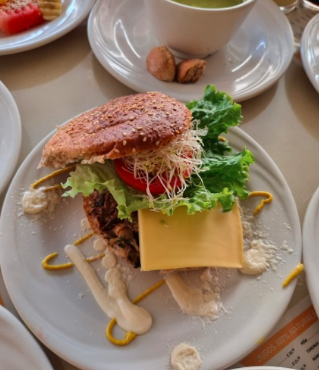 Hecha con pan integral, steak de Lentejas, lechuga, jitomate y queso manchego. Acompañada con ensalada o papas a la francesa.