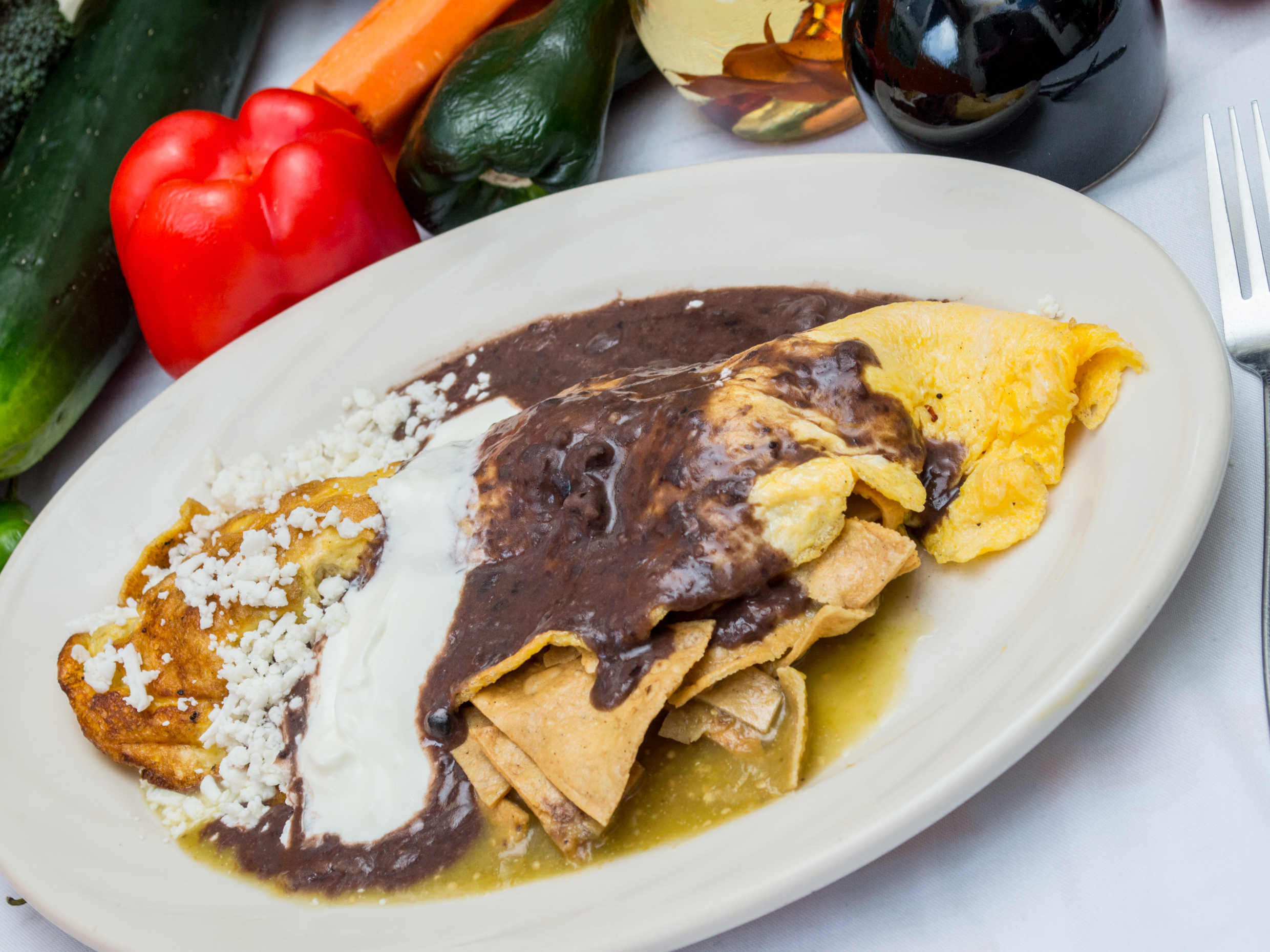 Relleno de chilaquiles, bañado con caldillo de frijol. Incluye café americano 10 oz. Y ensalada de frutas.