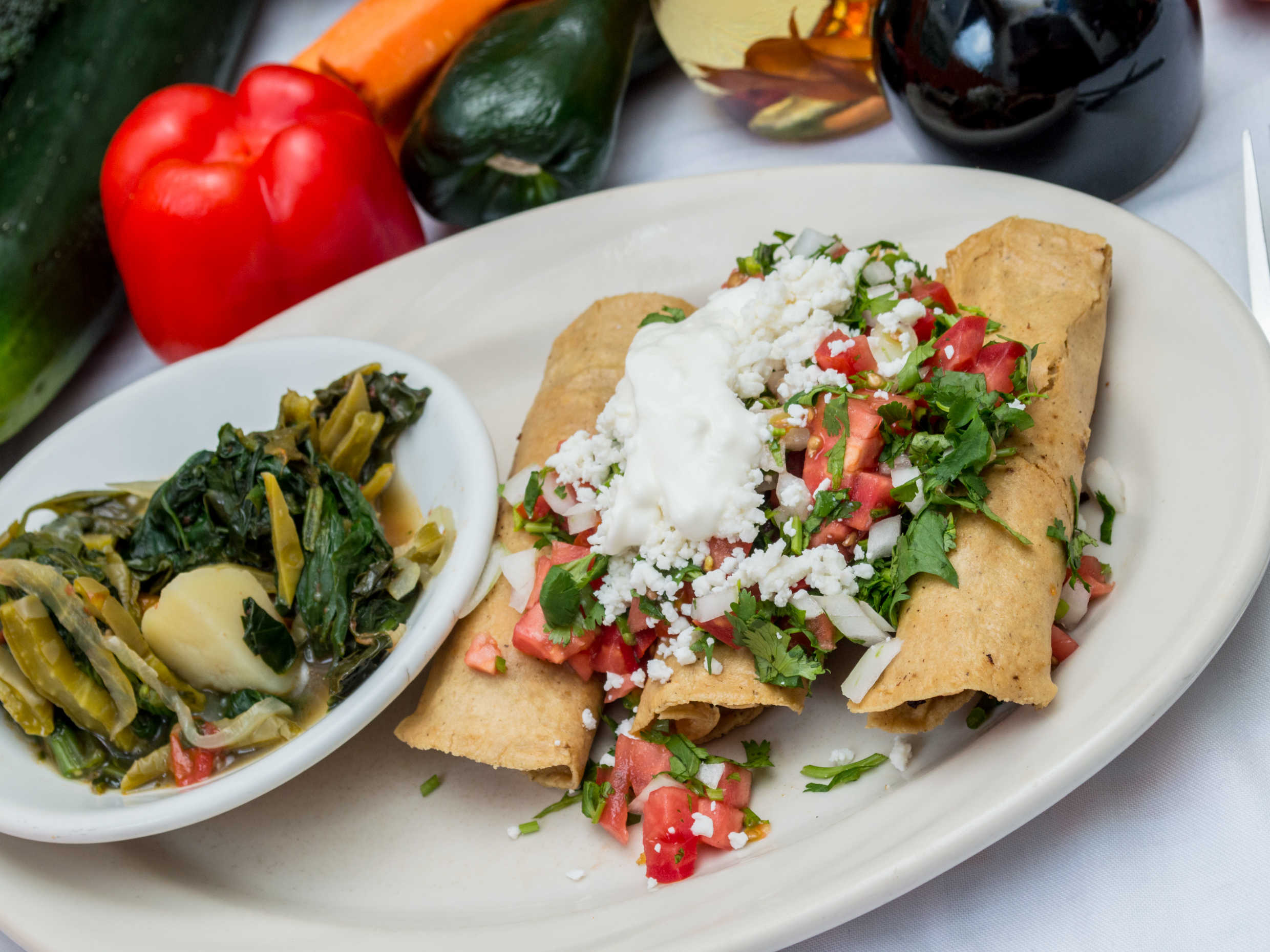 Tacos dorados rellenos de zanahoria con requesón, acompañados con queso, crema, salsa mexicana y guarnición de frijoles de la olla.