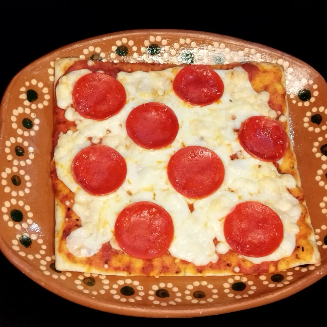 Pizza cuadrada INDIVIDUAL (20cm*20cm) con masa receta de la casa de 4 rebanadas con salsa de tomate, queso mozzarella y pepperoni