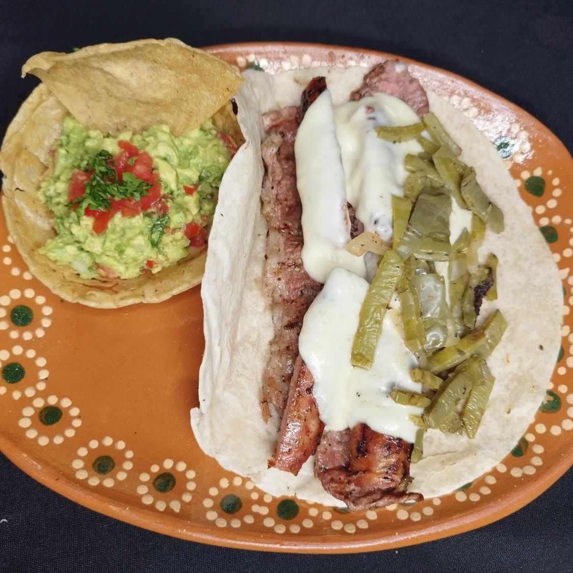 Tortilla grande de harina con 80 g de chorizo argentino, 80 g de picaña, gratinado, acompañado con nopales y guarnición de guacamole.