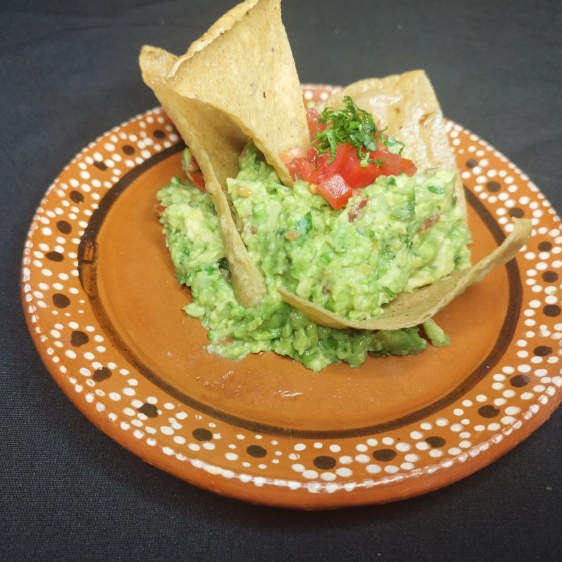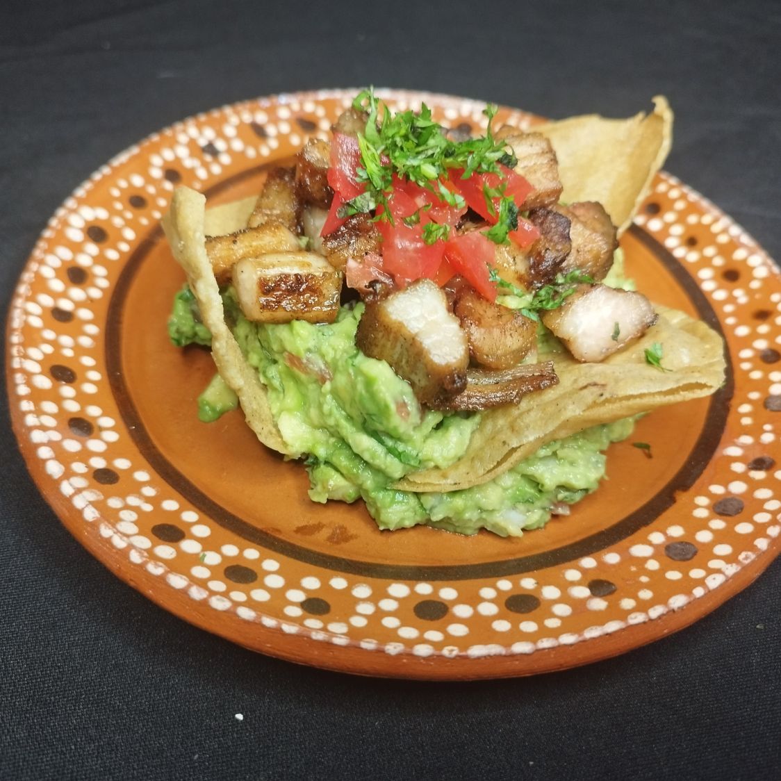 200 g de guacamole, acompañado con chicharrón de barriga y totopos.