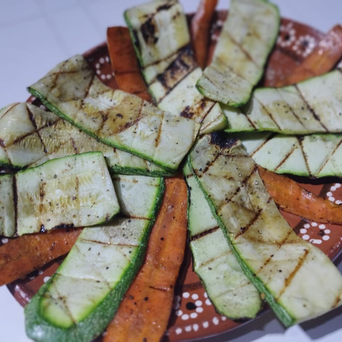 Láminas de calabaza italiana y zanahoria asadas al carbón con un toque de especias.