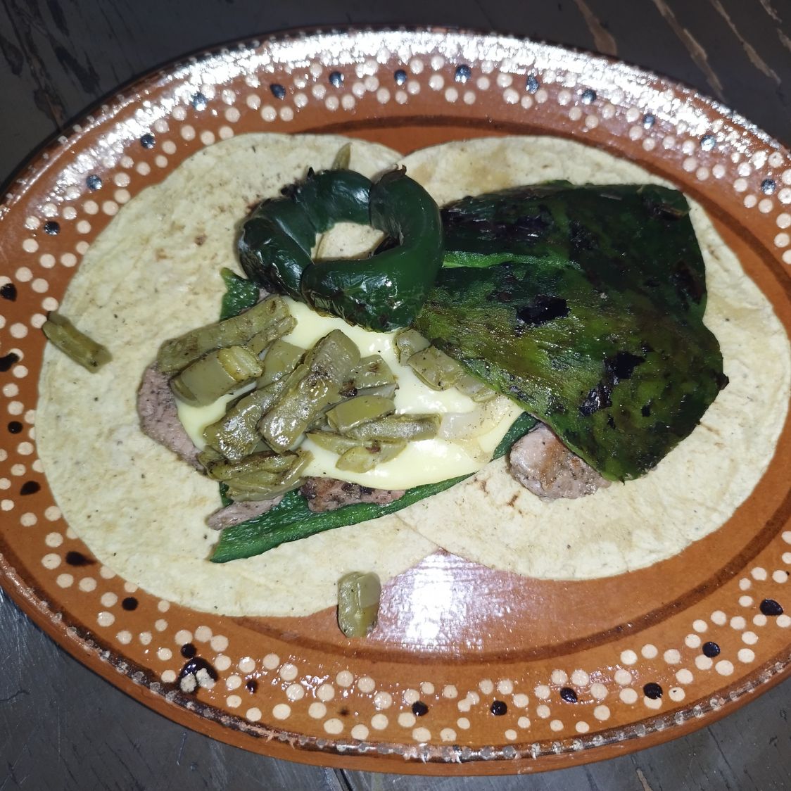 Un chile poblano tatemado a la brasa, gratinado y montado sobre 2 tortillas de maíz con 80 g de carne.
