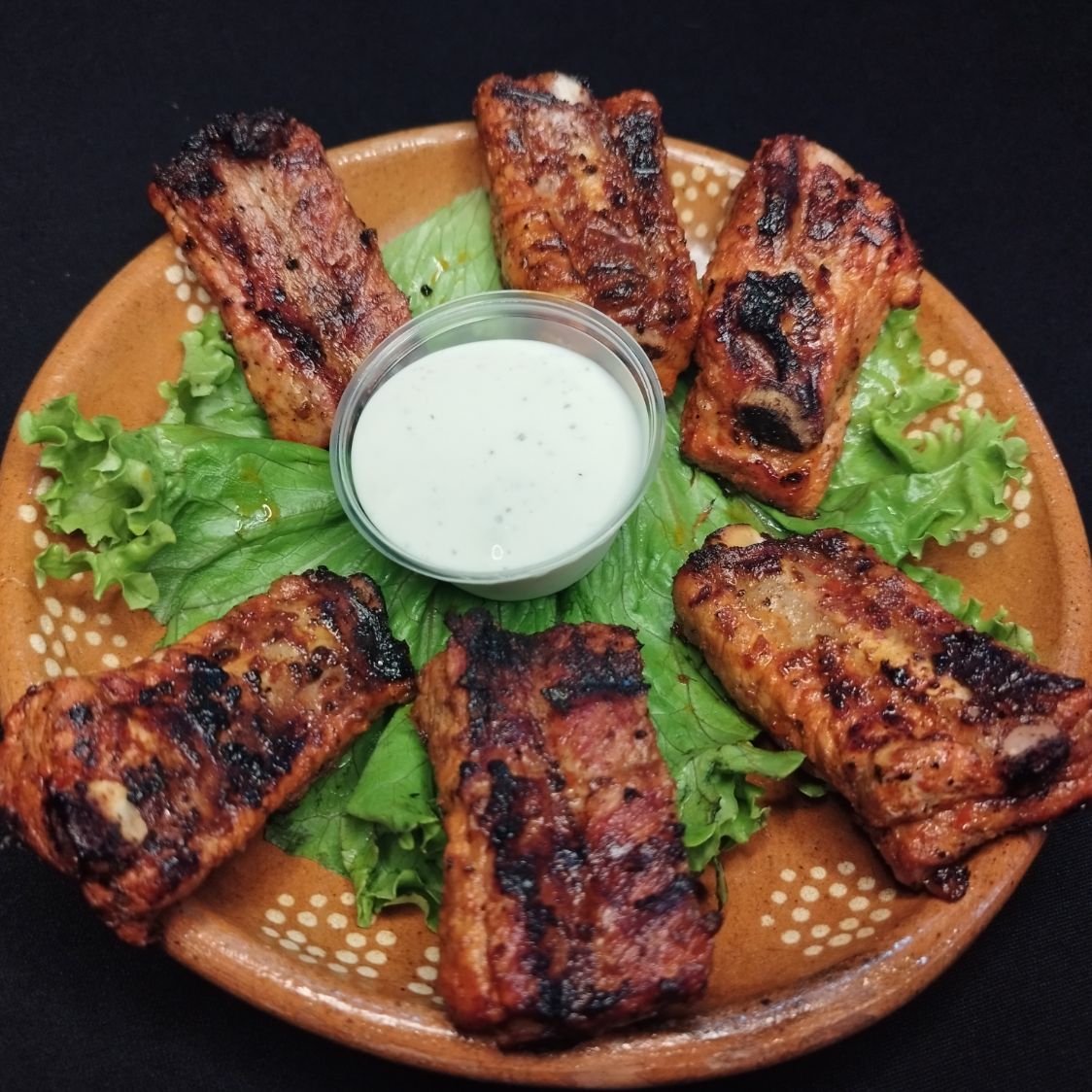 6 costillitas bañadas en salsa de tu eleccion, acompañadas con lechuga y aderezo ranch