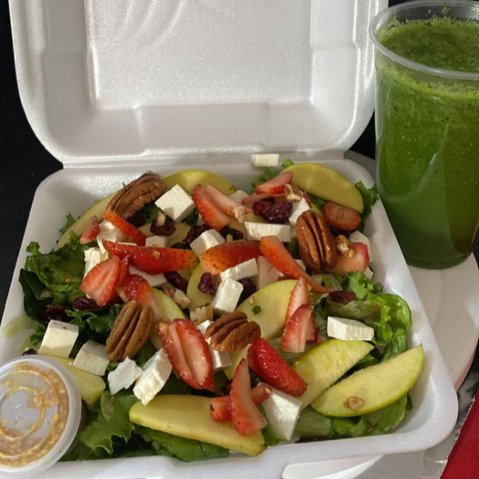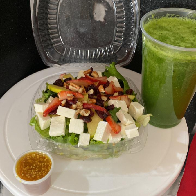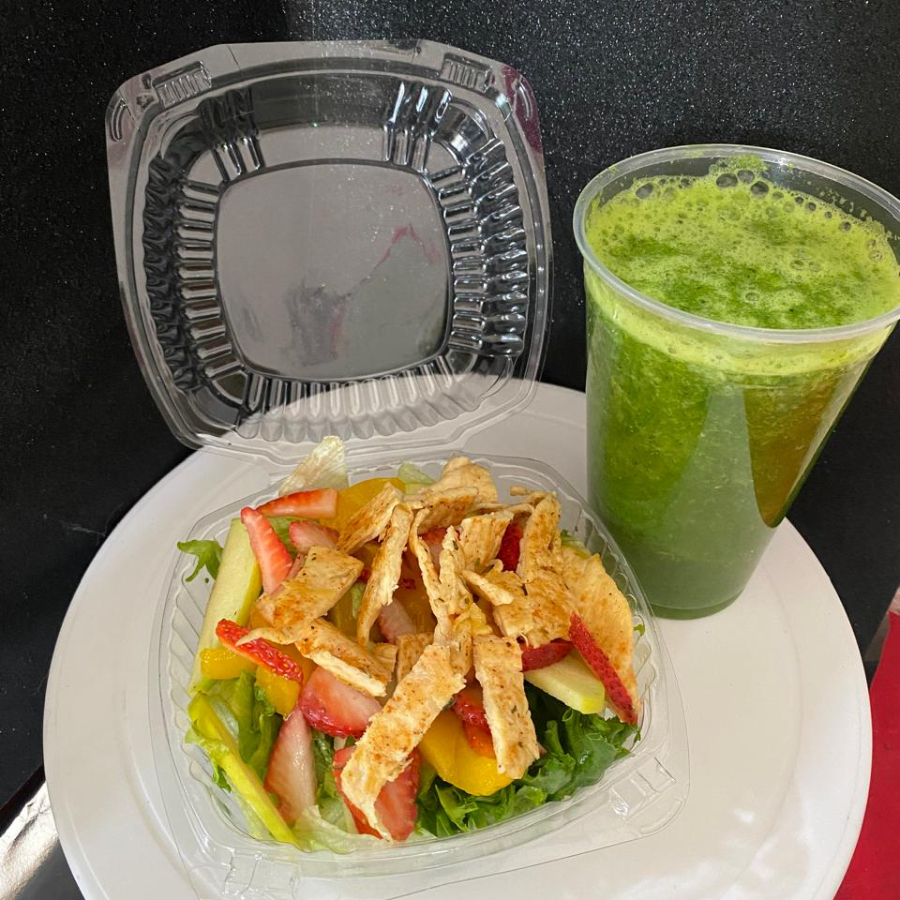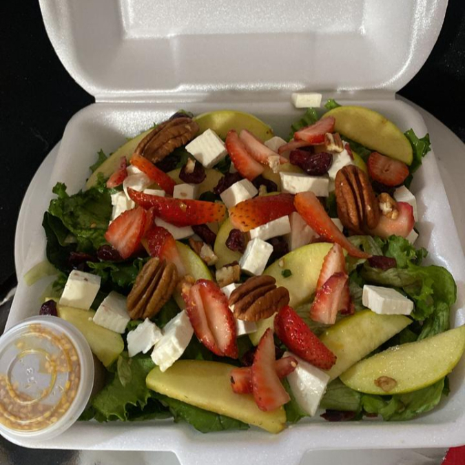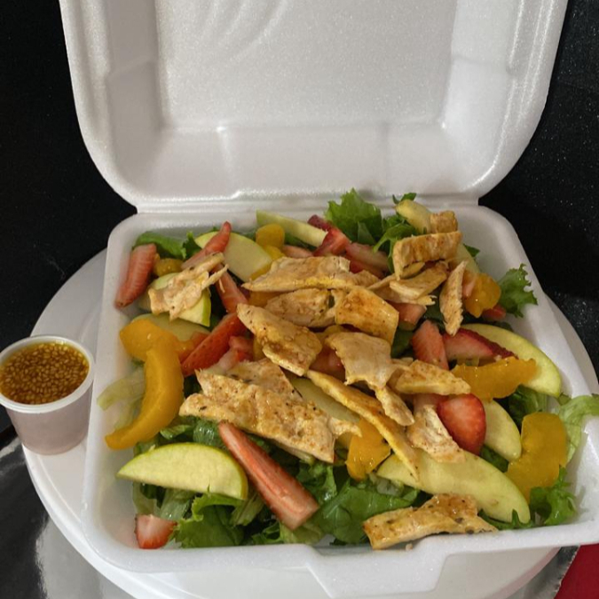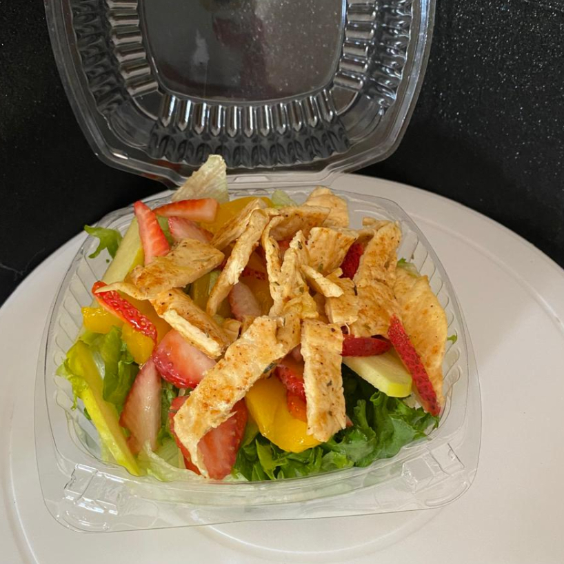 Una mezcla fresca de lechuga italiana y romana, acompañada de jugoso durazno, fresas dulces, crujiente manzana y tierna pechuga asada, que combina frescura y sabor en cada bocado. Acompañado de aderezo de miel.