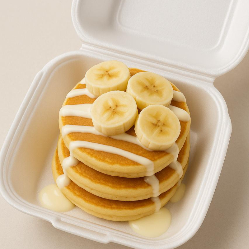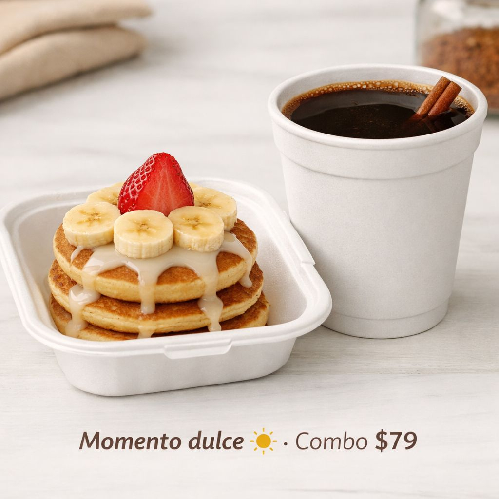 Tres Mini hot cakes esponjosos con lechera, rodajas de plátano y fresa fresca, acompañados de café de olla caliente (500 ml) con canela. Un combo dulce, reconfortante y lleno de sabor casero para disfrutar a cualquier hora del día.