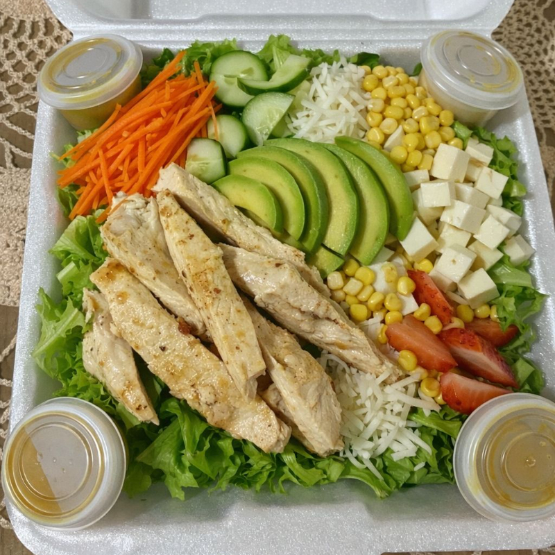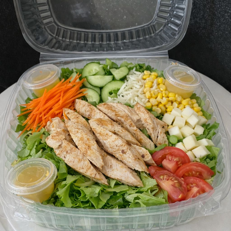 na ensalada completa, fresca y colorida que te llena sin pesarte. Preparada con lechuga orejona crujiente, zanahoria rallada, pepino fresco, jícama rallada, granos de elote dulce, cubos de queso panela y jugosos gajos de jitomate, coronada con tiras de pechuga de pollo a la plancha perfectamente sazonadas. Acompañada de aderezos caseros en vasitos individuales para mantener su frescura hasta el mo