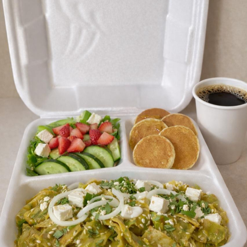Chilaquiles verdes con el sazón de casa, acompañados de ensalada fresca con fruta y mini hot cakes con lechera. Incluye café de olla recién hecho, para disfrutar un desayuno completo y reconfortante. ☕💛