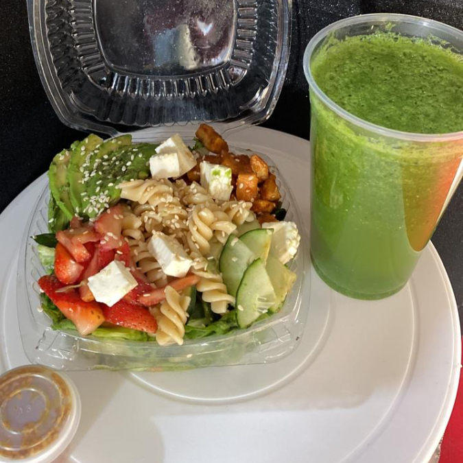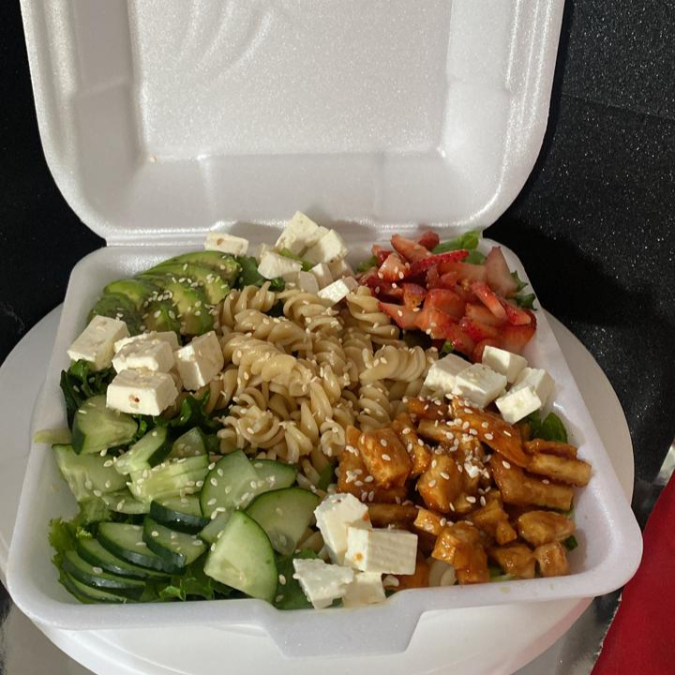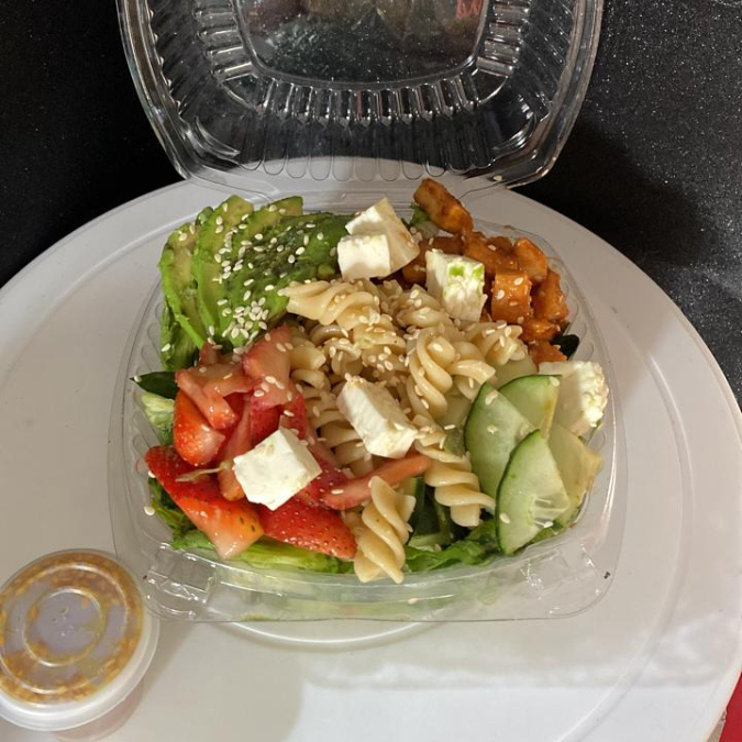 Una combinación fresca y deliciosa que lo tiene todo. Nuestra Ensalada Deluxe mezcla de lechuga, pepino fresco y pasta fusilli con el toque dulce de fresas naturales y la suavidad del aguacate. Elige tu estilo de pollo favorito: Empanizadp clásico, bufalo, BBQ o asado, para darle el sabor que mas se te antoje. PERFECTA PARA QUIENES BUSCAN UNA COMIDA COMPLETA, EQUILIBRADA Y CON UN TOQUE GOURMET.
