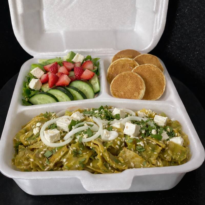 Chilaquiles verdes con queso fresco, crema, cebolla y cilantro, acompañados de una ensalada fresca con manzana, fresa y pepino, y cuatro mini hot cakes con lechera. Un desayuno completo y delicioso. NO INCLUYE BEBIDA.