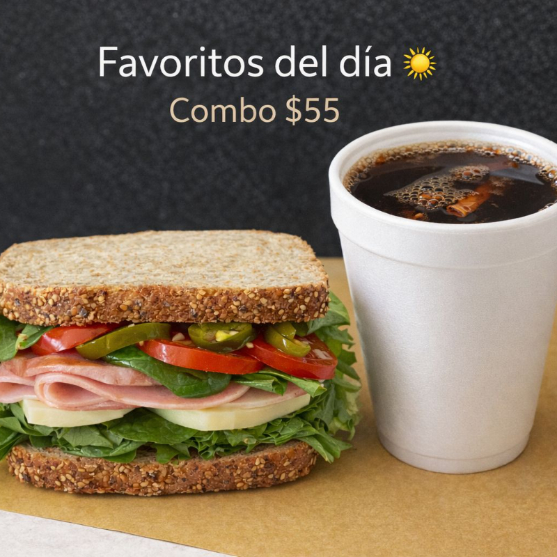 Sándwich integral con jamón de pavo, queso panela, espinaca, lechuga, pepino y rajas de chile, acompañado de café de olla casero (500 ml). Sabor casero con un toque moderno, ideal para cualquier hora.