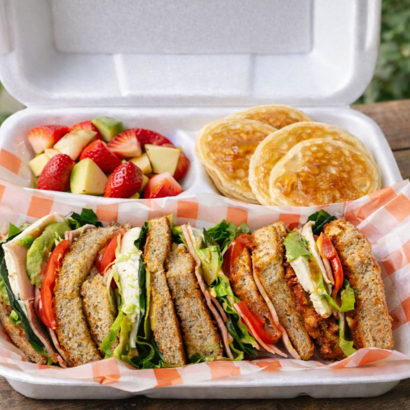 Desayuno completo y saludable que incluye un sándwich con pan integral, relleno de jamón de pavo, queso panela, lechuga, espinaca, jitomate, pepino y cebolla, acompañado de 4 esponjosos hotcakes con miel maple y un mini cóctel de fruta fresca (plátano, fresa, papaya o manzana).