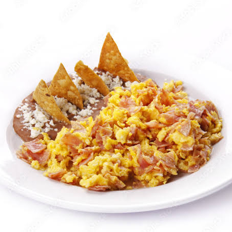 Tres huevos frescos con trocitos de jamón doraditos, acompañados de suaves frijoles refritos y una porción de pasta con mantequilla a las finas hierbas. Un desayuno completo, casero y lleno de sabor para empezar el día con energía.