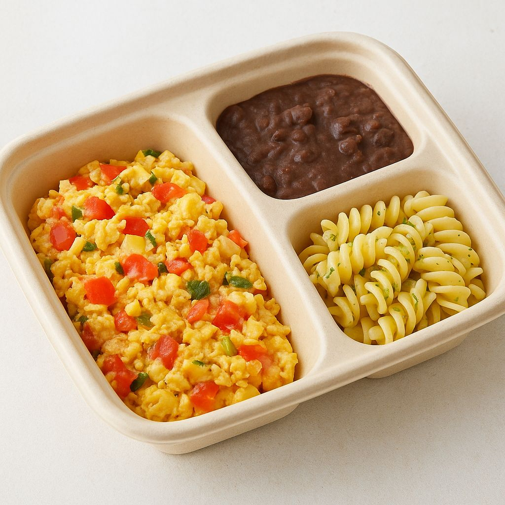 Huevos revueltos con jitomate, cebolla y chile, acompañados de frijoles y pasta con mantequilla y finas hierbas. Listo para un desayuno delicioso y balanceado
